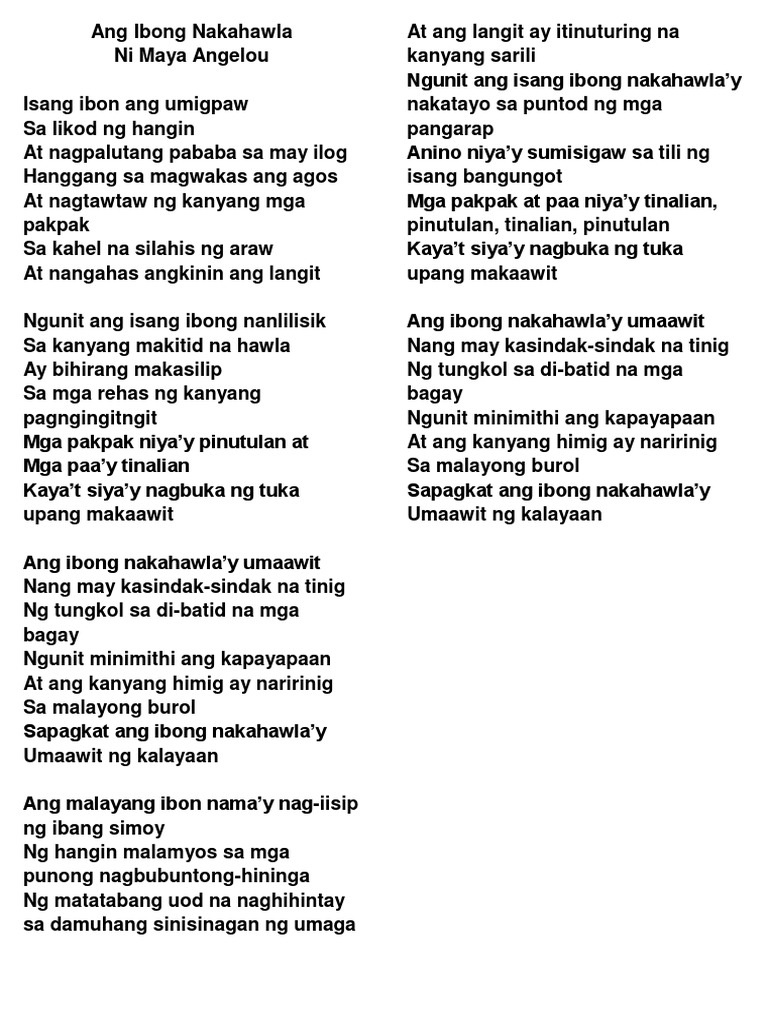 Nagtawtaw ng kanyang mga pakpak. Sa kanyang makitid na hawla. O Scribd é o maior site social de leitura e publicação do mundo. At nagpalutang pababa sa may ilog Haggang sa magwakas ang agos At nagtawtaw ng kanyang mga pakpak Sa kahel na silahis ng araw At nangahas angkinin ang langit.